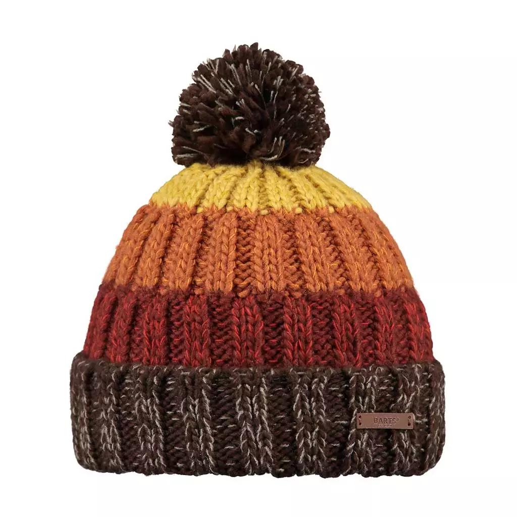- Retro-inspired striped design with a pom-pom