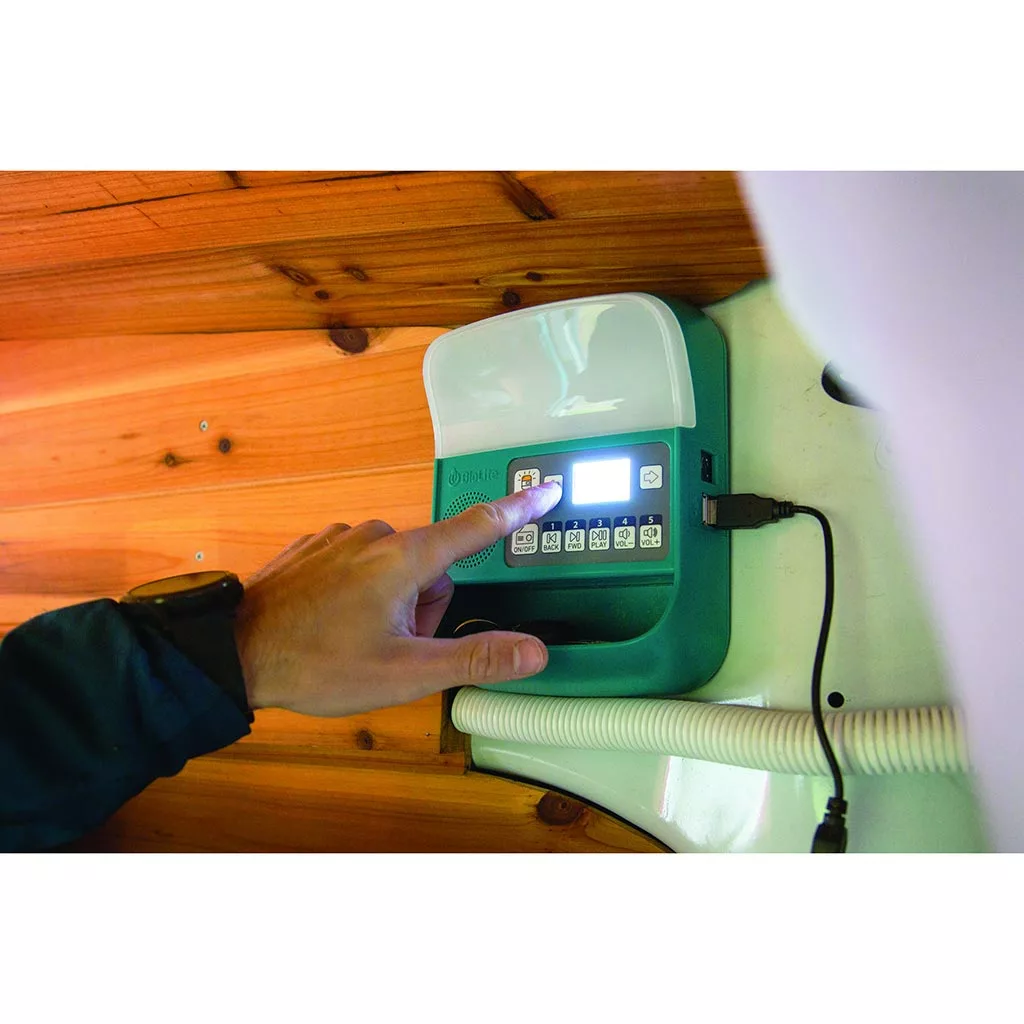 - The wall mounted control box allows you to monitor your power, charge devices and play music