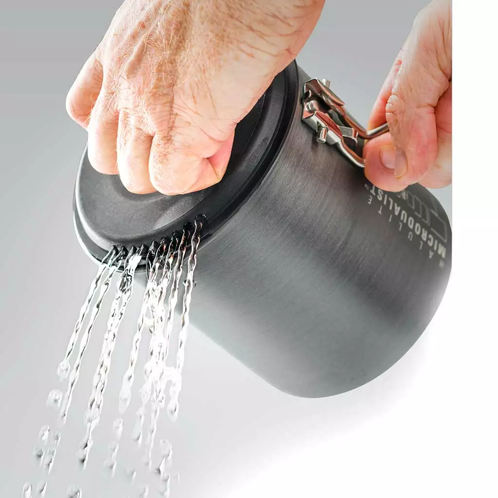 - Two-person system includes: Nylon strainer lid, two Folding Foons, two insulated mugs with sip-it tops and nesting bowls, and a hard anodised 1.4 litre pot. Waterproof storage bag also serves as a camp kitchen sink