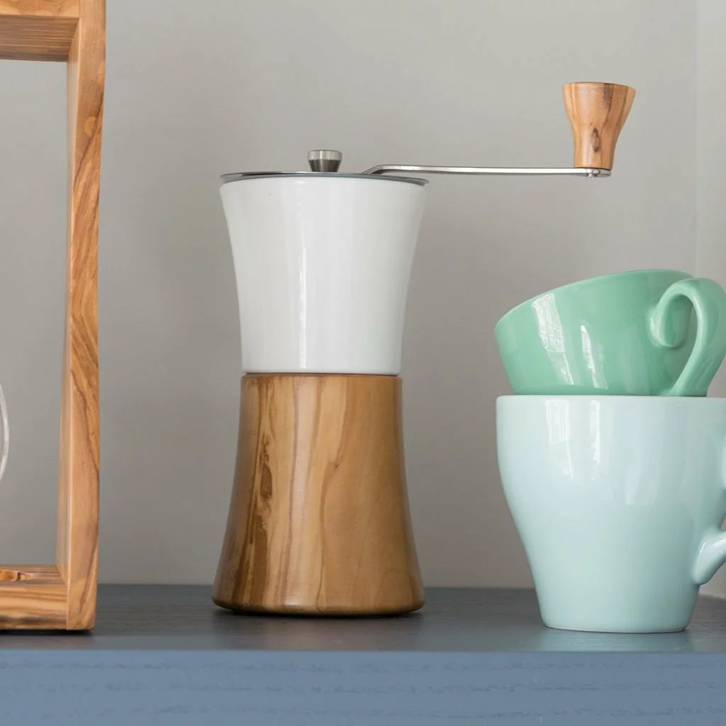 Made in Japan from premium materials, this stylish Hario coffee mill is a manual coffee grinder that adds a touch of style to any kitchen. With a white ceramic top hopper cover and a natural olive wood bottom, it looks great and feels even better in the hand, allowing you to grind your own beans easily and quickly. The internal ceramic burrs offer superb consistency, while a simple adjustable nut allows you to set and tweak the fineness or coarseness of your grind. The mill is also simple to dismantle and wash, meaning it is bound to get daily use as part of your morning routine.