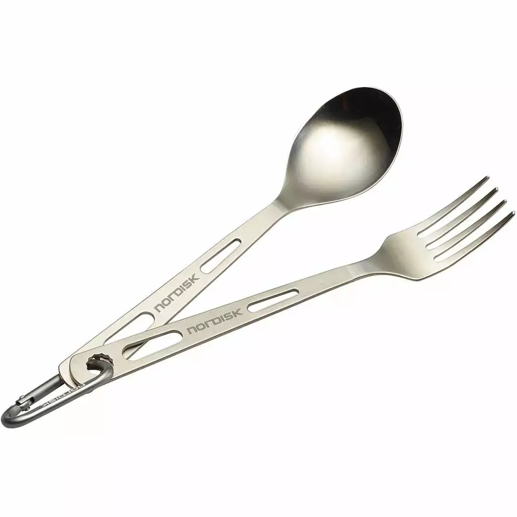 The titanium utensil set consists of a full-sized fork and spoon. Both are made of titanium, taking up very little space, and weighing close to nothing. The carved out holes in the handles reduces weight and the choice of titanium adds strength and sturdiness to the construction, both the fork and spoon are equipped with polished eating surfaces and milled handles for a better grip. Both pieces are equipped with an angular hole for the enclosed carabiner, and the printed Nordisk nametag