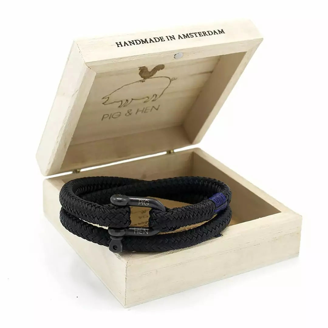 In the 17th century, Dutch sailors would tattoo the image of a pig and hen onto their feet to bring them luck if their ship sank, and to bring them safely home from far-flung lands. In the 21st century, Pig & Hen make bracelets by hand in Amsterdam, using authentic ship’s rope to honour that heritage.