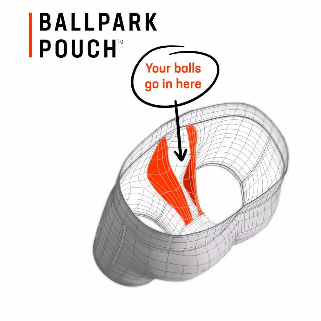 - Patented 3D BallPark Pouch keeps everything in place down there, with mesh panels that create a permanent divide between your balls and your thighs. This means no more sticking or discomfort, plus plenty of natural support