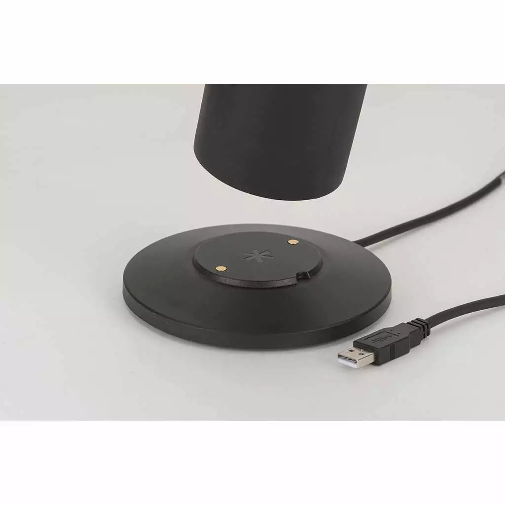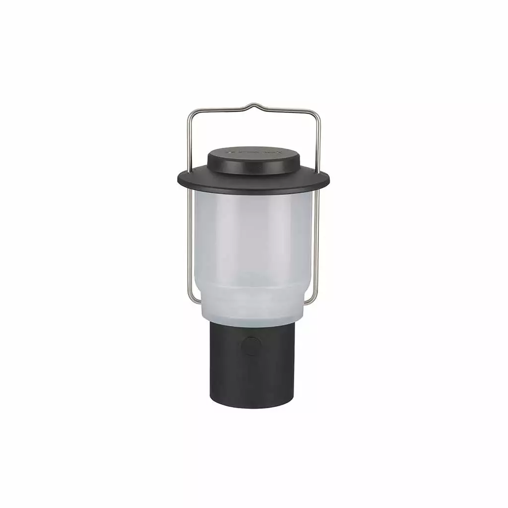 The Home & Camp Lantern is a rechargeable and portable lamp. It has a USB charging stand, an adjustable handle, and a dimmable warm light. To use, push the power button once to turn on and off, and hold the power button down to adjust the brightness.