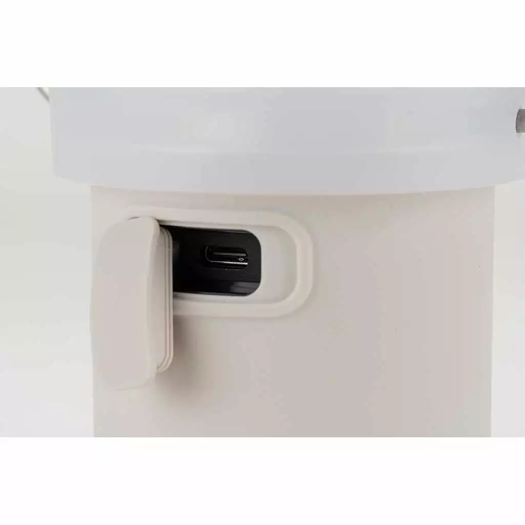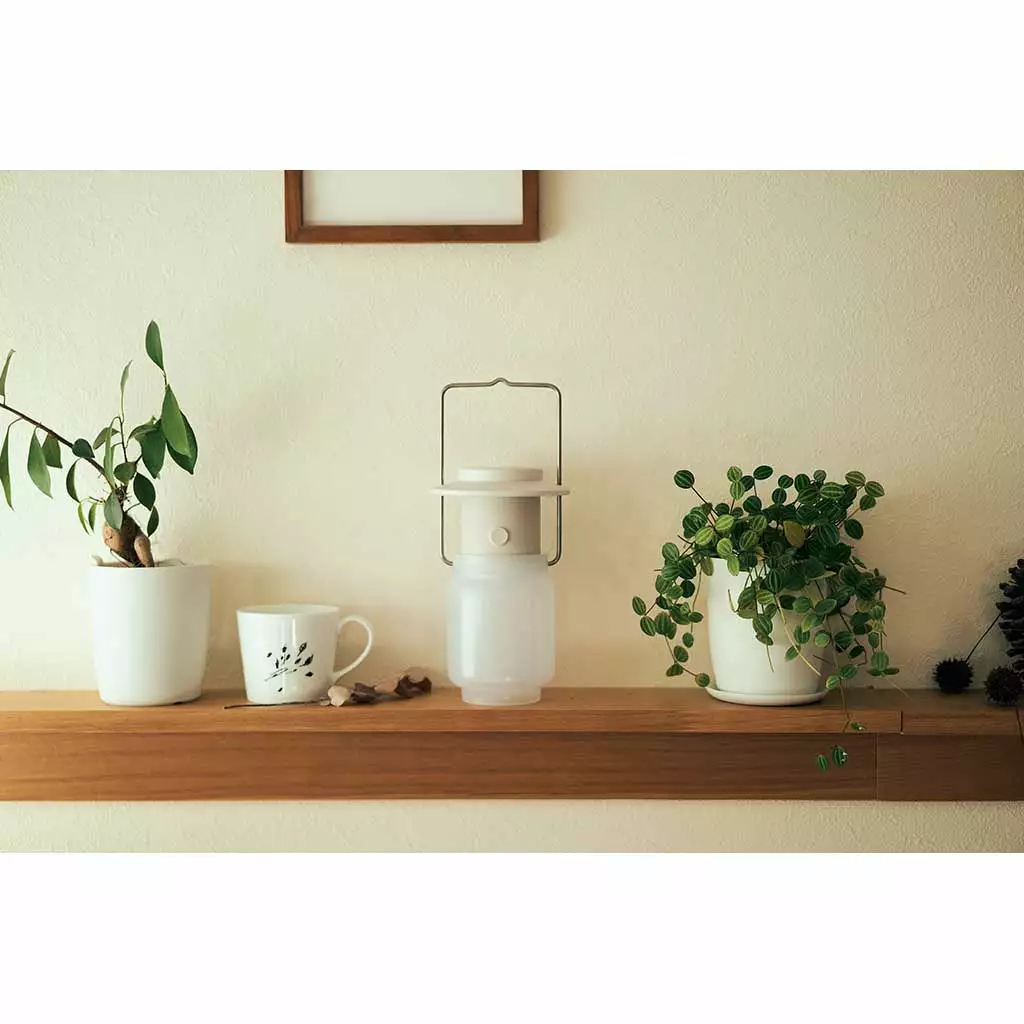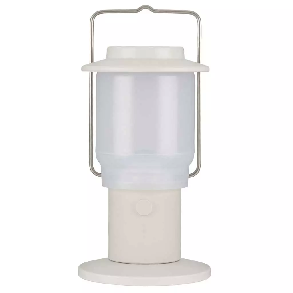 The Home & Camp Lantern is a rechargeable and portable lamp. It has a USB charging stand, an adjustable handle, and a dimmable warm light. To use, push the power button once to turn on and off, and hold the power button down to adjust the brightness.