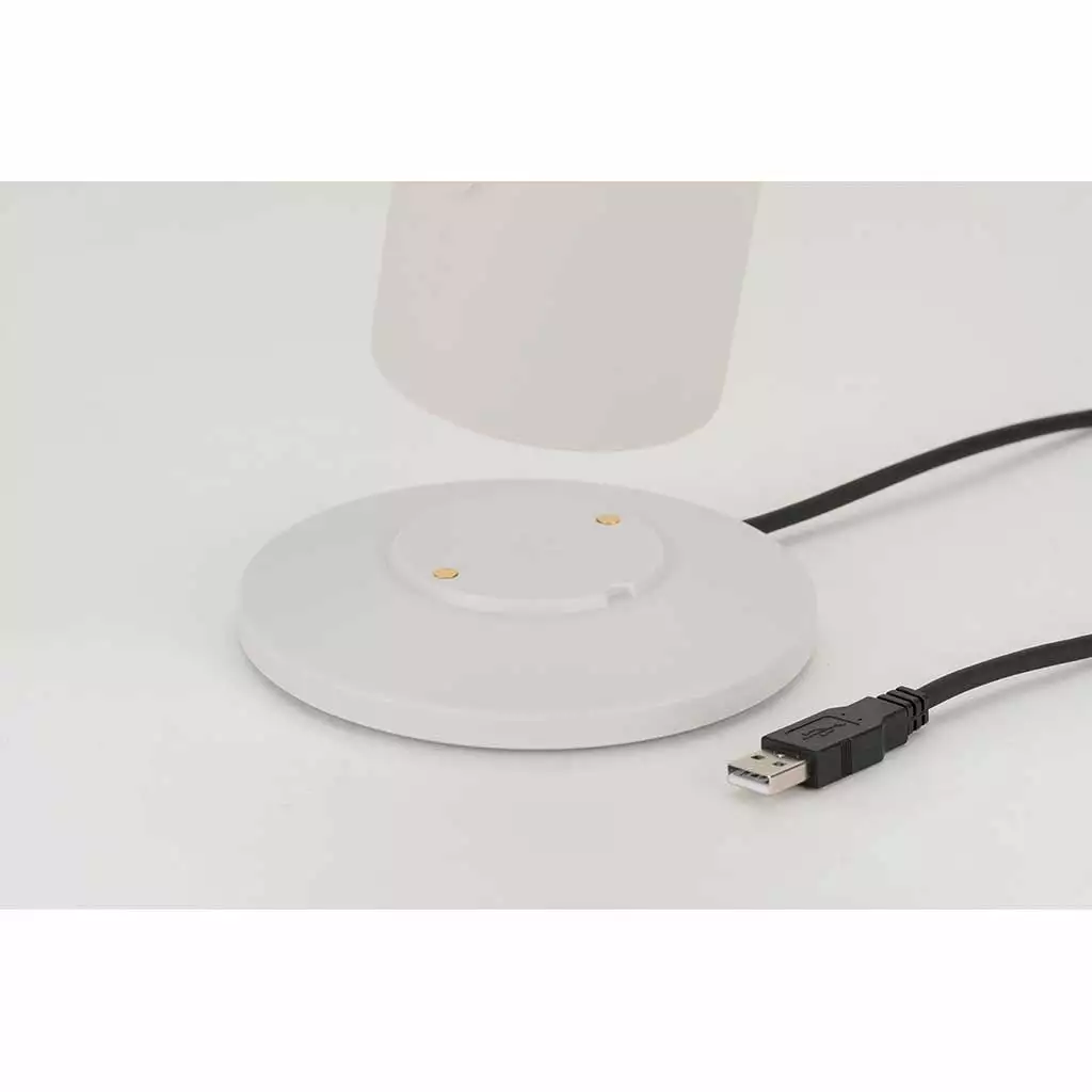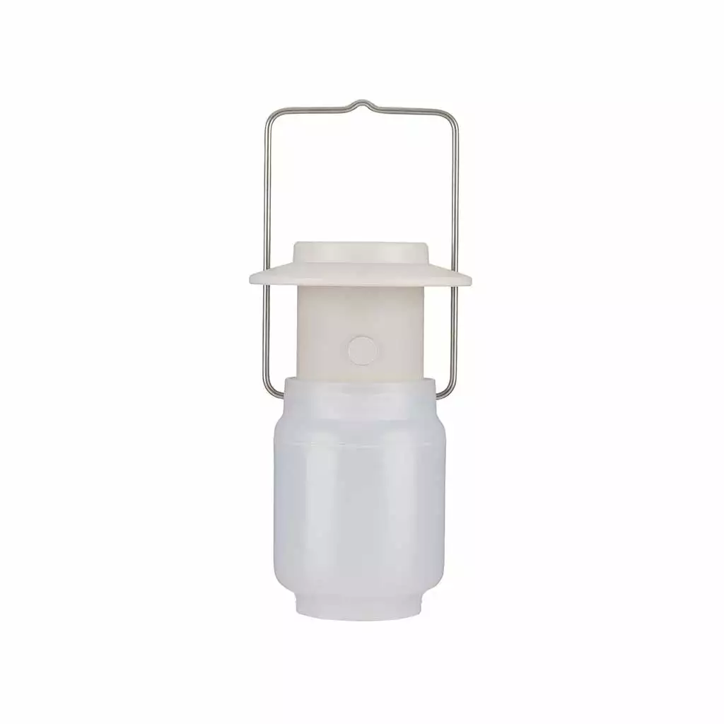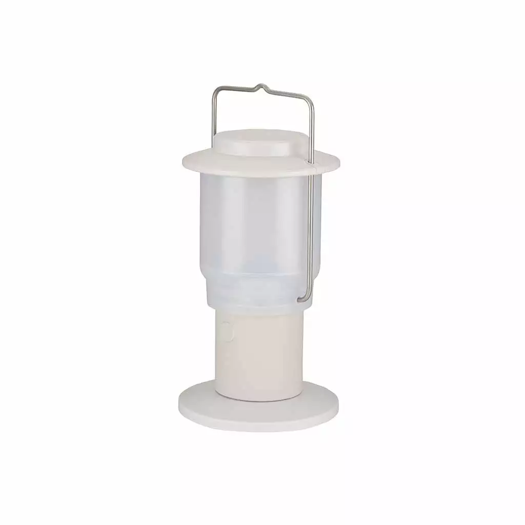 The Home & Camp Lantern is a rechargeable and portable lamp. It has a USB charging stand, an adjustable handle, and a dimmable warm light. To use, push the power button once to turn on and off, and hold the power button down to adjust the brightness.