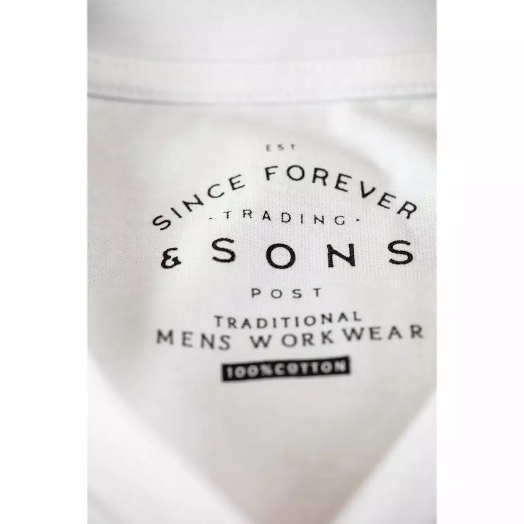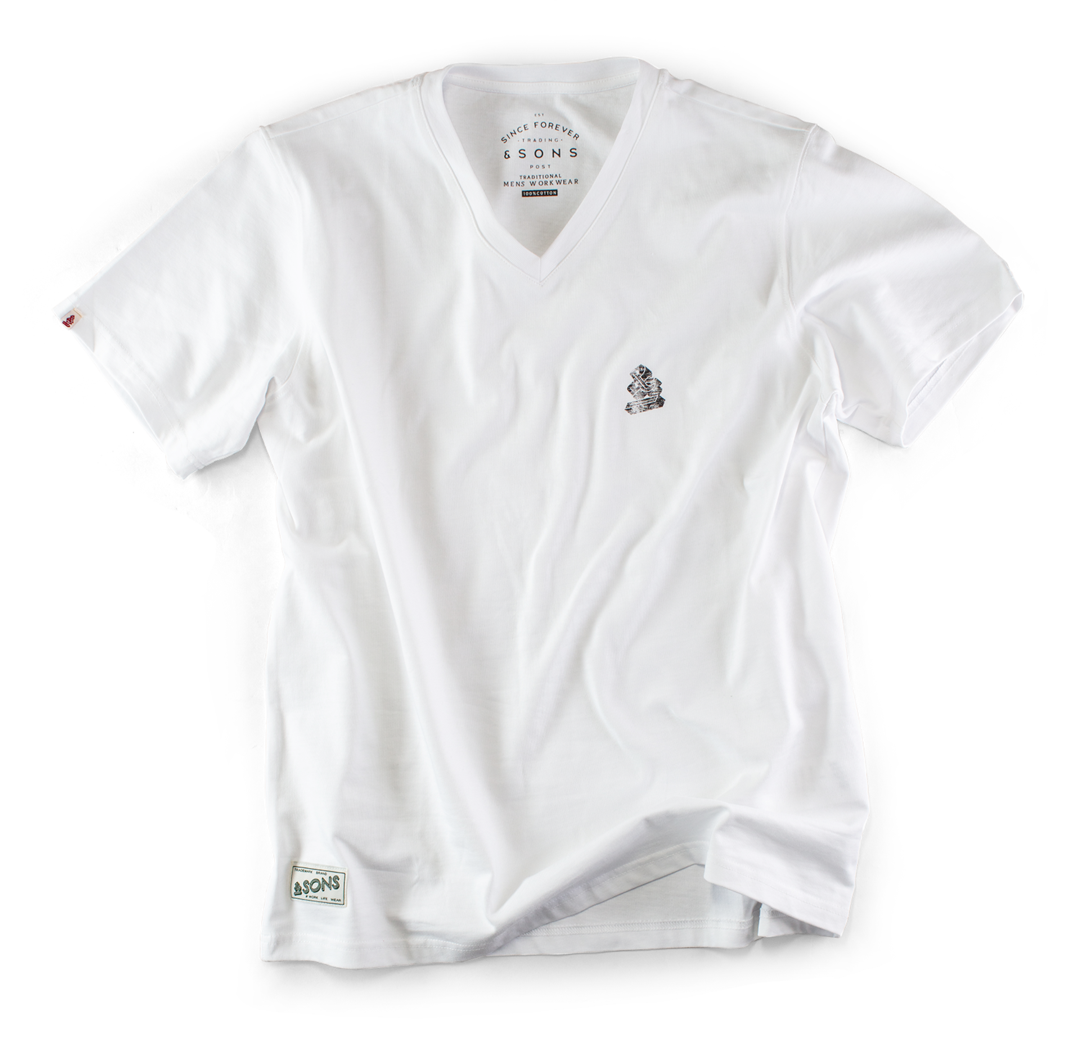 A classic v-neck 1960’s inspired T-shirt with a beautiful worn-in feel, thanks to the &SONS vintage wash process. Crisp white with faded and edges and Trading Post print inside the neck finished with our classic logo label on the sleeve.