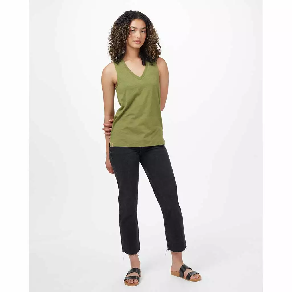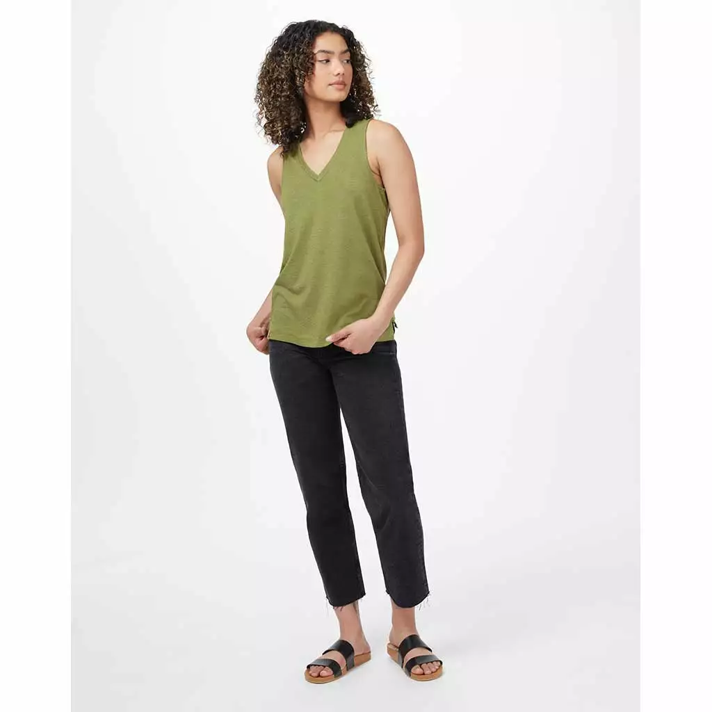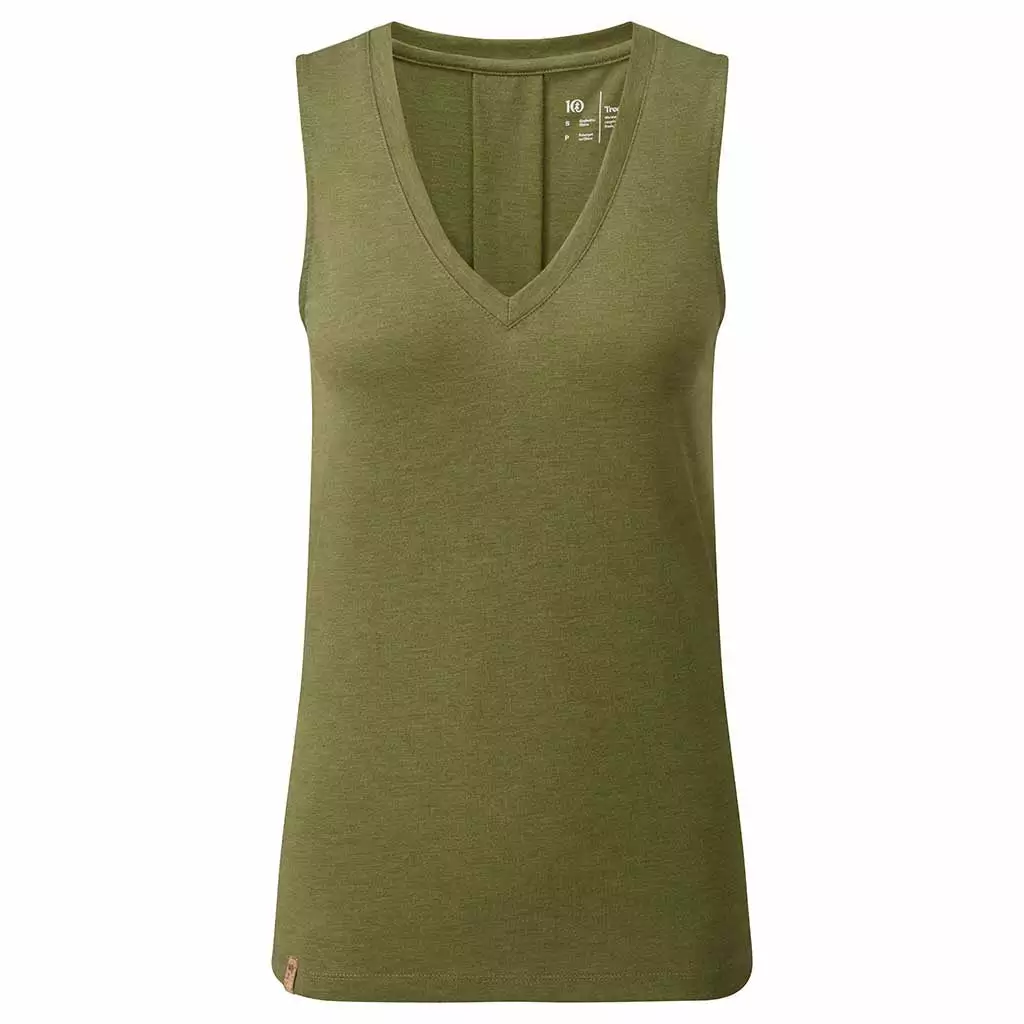 V-neck tank-top with back pleat and hi-low hem. Easy styling with a conscience – made from organic cotton, recycled polyester and TreeBlend wood pulp.